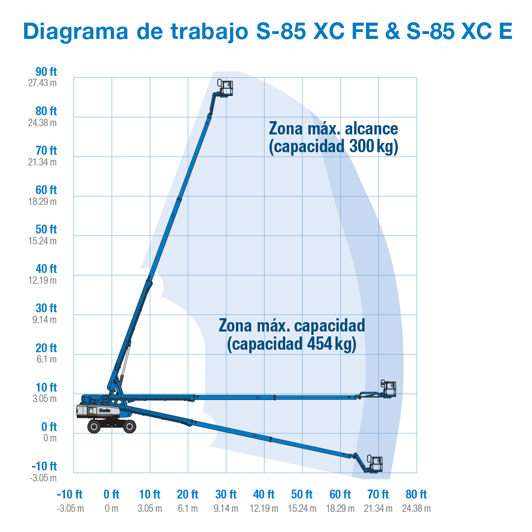 La plataforma telescópica eléctrica Genie S®-85 XC™ E es un modelo electrificado de la serie Xtra Capacity™ (XC), que combina un rendimiento equivalente a una unidad diésel, con la ventaja de prestaciones silenciosas y sin emisiones. La característica XC permite llevar a bordo hasta tres personas junto con herramientas y materiales de trabajo.